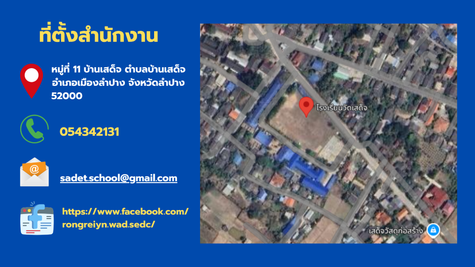 หมู่ที่ 11 บ้านเสด็จ ตำบลบ้านเสด็จ อำเภอเมืองลำปาง จังหวัดลำปาง 52000 เบอร์โทรศัพท์ 054342131 เบอร์โทรสาร - Email : sadet.school@gmail.com Facebook : https://www.facebook.com/rongreiyn.wad.sedc/ กรอกแบบฟอร์ม