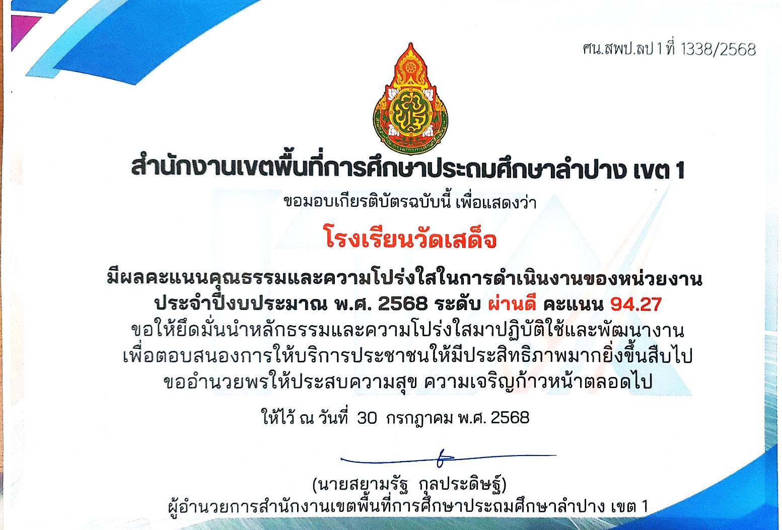 เกียริตบัตรคะแนนคุณธรรมและความโปร่งใส ITA 2568 ระดับ ผ่านดี