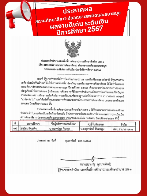 สถานศึกษาสีขาว ปลอดภัยยาเสพติดและอบายมุข 2567